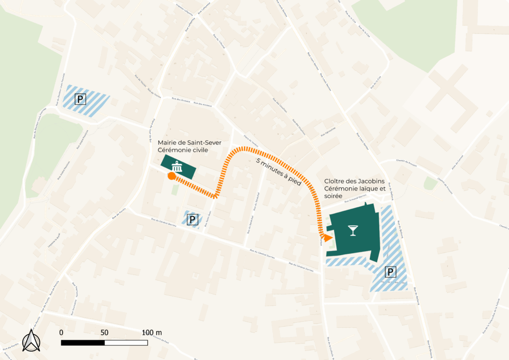 L’Hôtel de Ville où sera célébré le mariage civil est à 5 minutes de marche (sans se presser) du Cloître des Jacobins où se dérouleront le reste des festivités. Le plus simple est donc de vous garer et de marcher d’un lieu à l’autre dans la bonne humeur.